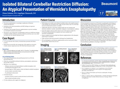 • Wernicke encephalopathy is a neurologic complication of thiamine (vitamin B1) deficiency • Familiarity with clinical presentation and MRI findings are important for rapid diagnosis • Treatment is with emergent thiamine supplementation to prevent morbidity (i.e. Korsakoff syndrome) and mortality1 • We present a case of Wernicke’s encephalopathy with the rare MRI brain finding of isolated cerebellar diffusion restriction, which has only been seen in one other case report, per our extensive literature review