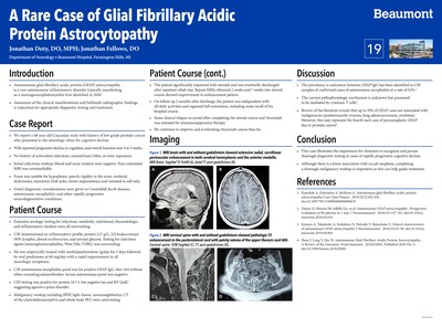 • Autoimmune glial fibrillary acidic protein (GFAP) astrocytopathy is a rare autoimmune inflammatory disorder typically manifesting as a meningoencephalomyelitis first identified in 20161 . • Awareness of the clinical manifestations and hallmark radiographic findings is important for appropriate diagnostic testing and treatment.