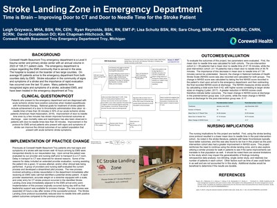 • Stroke Landing Zone in Emergency Department Time is Brain – Improving Door to CT and Door to Needle Time for the Stroke Patient by Leigh Grzywacz, Ryan Reynolds, Lisa Schultz, Sara Chung, David Donaldson, and Kim Chapman-Hitchcock