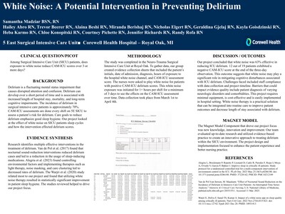 Delirium is a fluctuating mental status impairment that causes disrupted attention and confusion. Delirium can develop over a short period of time and is associated with increased length of hospital stay, mortality, and long-term cognitive impairments. The incidence of delirium in surgical intensive care patients is approximately 70%. CAM-ICU assessments are done every shift on 5E SICU to assess a patient’s risk for delirium. Care goals to reduce delirium emphasize good sleep hygiene. Our project looked at the effect of white noise on SICU patients sleep cycles and how the intervention effected delirium scores.