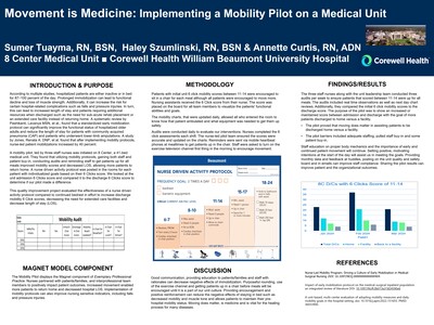 The mobility pilot is a nurse-driven initiative that encourages nurses to ambulate and mobilize their patients' multiple times a day. Any form of mobility has been shown to improve aerobic capacity and shorten length of stay significantly for medical patients compared to conventional care (Hook, M., Dailey, M.S., Singh, M., Shneuker, D., Mitchell, L., Milligan, K., … Kelly, L. (2024). Our goal on 8 Center is to decrease the number of discharges to rehabilitation facilities by keeping patients active during their hospital stay, with the goal to return home.