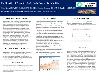 To maintain and improve patient mobility, nurses must take an active role in the ambulation and movement of their patients. This includes utilizing the 6- clicks scores, an assessment tool derived from the Active Measure for PostAcute Care (AM-PAC) used to measure basic mobility, daily activity, and applied cognition to determine discharge disposition (Warren, M., Knecht, J., Verheijde, J., Tompkins, J. (2021) as well as implementing a mobility audit to keep track of which patients should be ambulating and how often. This quality improvement project aimed to show how nurses can reduce the amount of rehabilitation admissions by increasing ambulation and mobility, promoting patient autonomy, and preserving their ADL function.